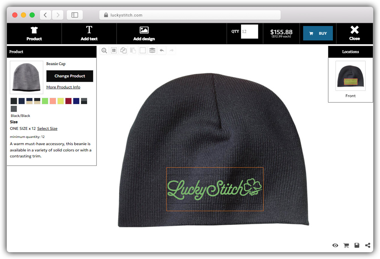 Design your custom merchandise in mere minutes! Our online designer gives you full control over product colors, logo size & placement, embroidery colors, and more.